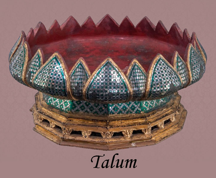 Enfin, il convient de mentionner les talum (ตะลุ่ม), que La Loubère définit comme des tables à rebord et sans pied appelées autrement bandéges, et nos marchands plateaux (16), et que Tachard assimile aux bossettes, ces boîtes honorifiques destinées à contenir du bétel : Le roi après avoir chargé M. l'ambassadeur de ses compliments pour le roi très chrétien et pour toute la Maison royale, lui fit présent d'un grand vase d'or qu'on appelle en Siamois Telom, et en portugais Bolseta, qui est la marque de grand oya et de prince. Il n'est permis qu'au seul prince de Cambodge d'en avoir un semblable à la Cour de Siam (17). Il semble qu'ici encore, les deux fassent quelques confusions. Le talum, distinct de la bossette (tiap : เตียบ), est une coupe de cérémonie à douze faces montée sur un piédestal. L'intérieur est laqué en rouge et l'extérieur en noir, généralement orné d'inscrutations de nacre ou de verre. Placé sur un autel dans un temple, l'objet contenait les offrandes destinées au Bouddha.